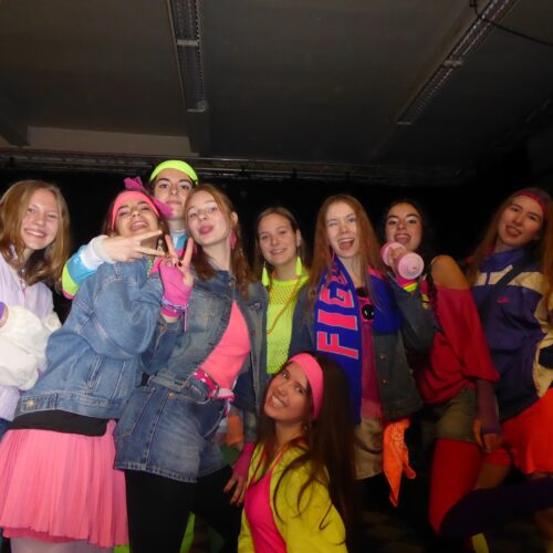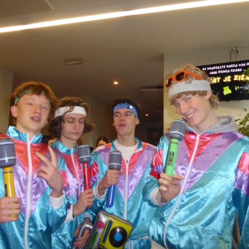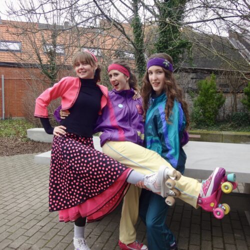 De 100-dagen zijn een rijke traditie op onze school: zowat halverwege het jaar vieren de zesdes alvast hun nakende afscheid van Sint-Jans. Die stap naar volwassenheid gaat gepaard met nog heel wat halfwassen ongein: een hele week bevolken kleurrijke, soms knotsgek verklede figuren de school, verschijnen verdachte posters in de gangen, en valt er met de zesdes dag na dag minder aan te vangen. Het thema van dit jaar – de eighties – leent zich natuurlijk tot knallende kleuren en fluo-accessoires, en dat hebben we geweten!