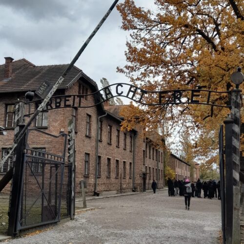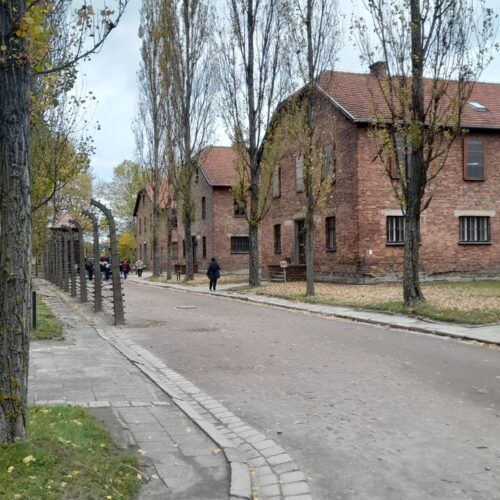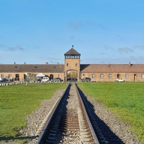 De eerste dag bezochten we Auschwitz I, het Stammlager. Vanaf het moment dat je onder de poort met “Arbeit macht frei” doorloopt, voel je hoe de sfeer plots verandert. Hoewel de zon tussen de bomen door scheen, hing er toch een kille stilte. We wandelden in de voetsporen van duizenden mannen, vrouwen en kinderen, van wie de stemmen verstomd zijn maar nooit verloren mogen gaan.