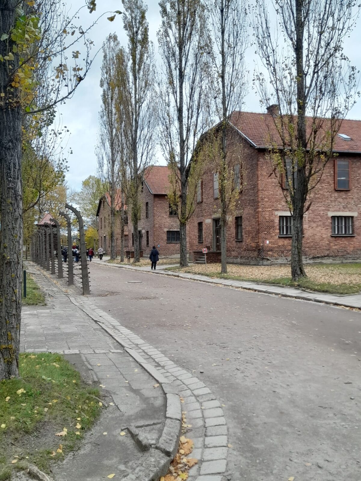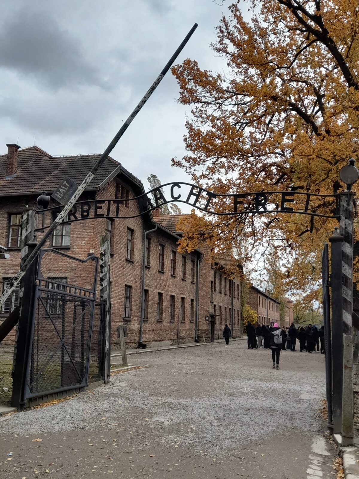 De eerste dag bezochten we Auschwitz I, het Stammlager. Vanaf het moment dat je onder de poort met “Arbeit macht frei” doorloopt, voel je hoe de sfeer plots verandert. Hoewel de zon tussen de bomen door scheen, hing er toch een kille stilte. We wandelden in de voetsporen van duizenden mannen, vrouwen en kinderen, van wie de stemmen verstomd zijn maar nooit verloren mogen gaan.