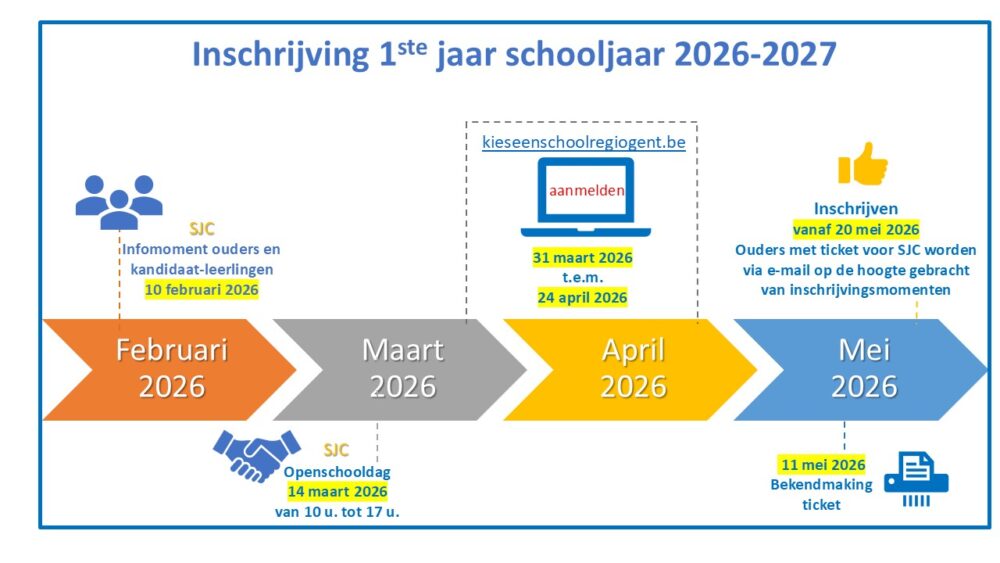 Inschrijvingen in Gent worden geregeld via het Lokaal Overlegplatform Secundair Onderwijs. Aanmelden kan van 31 maart 2026 om 12 uur tot 24 april 2026 om 12 uur. Binnen de aanmeldingsperiode meld je je digitaal aan via www.kieseenschoolregiogent.be. Binnen deze periode speelt het tijdstip van aanmelding geen rol. Broers en zussen (en kinderen van personeel) genieten van een voorrangsregel, maar moeten zich ook via deze website aanmelden! Na de aanmeldingsperiode word je per mail op de hoogte gebracht voor welke school je een ticket krijgt.