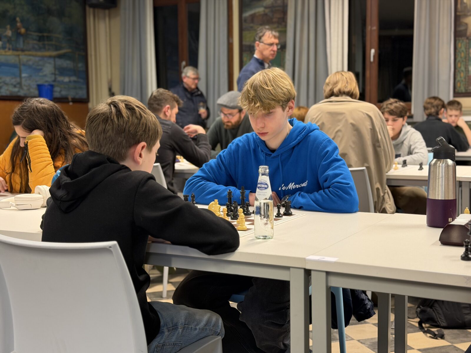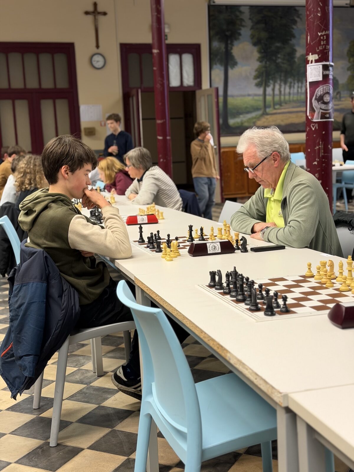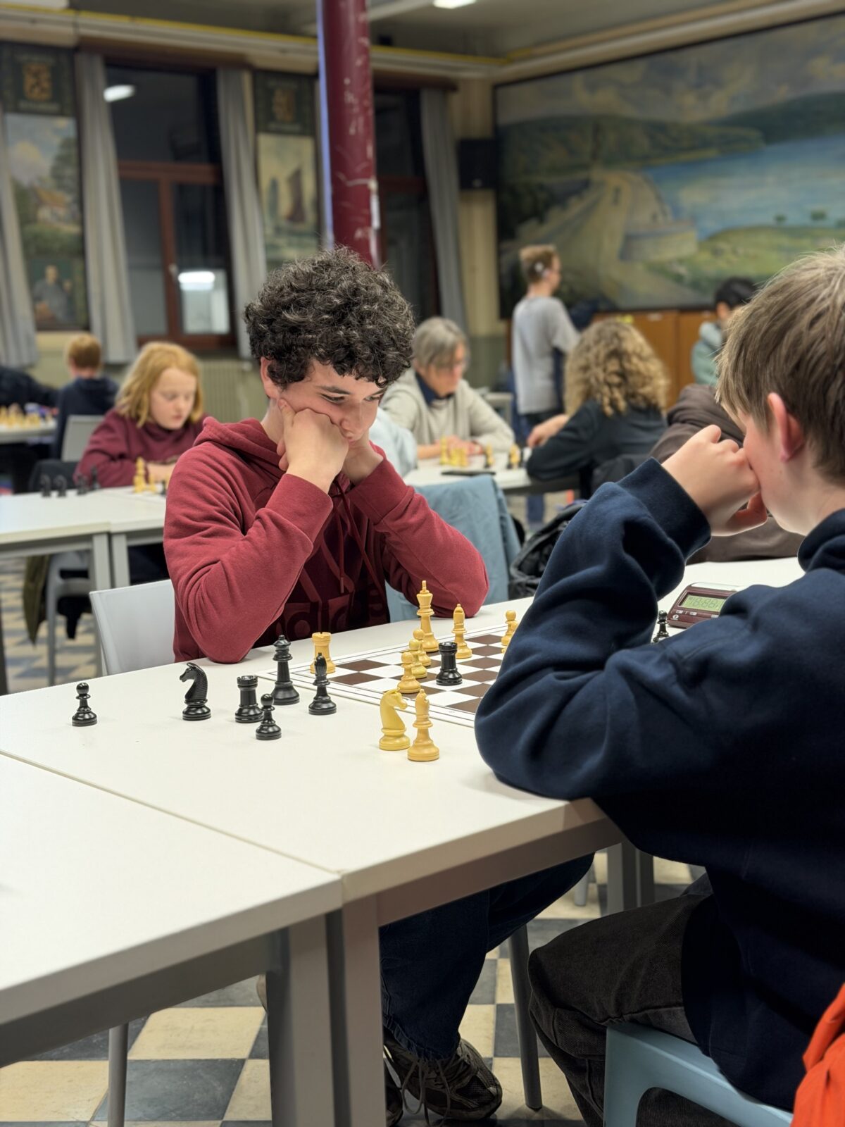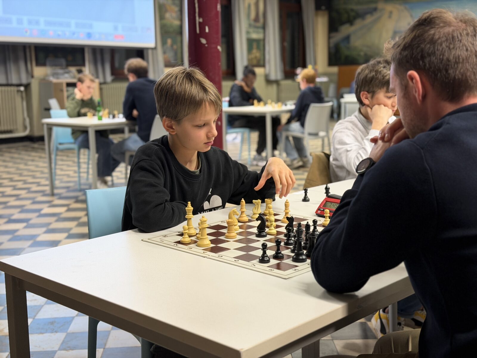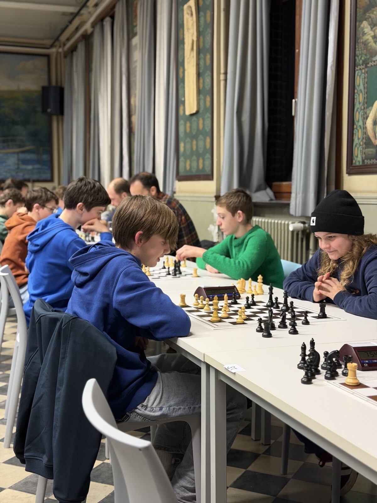 De ruime recreatiezaal van Campus Visitatie bood het perfecte decor voor deze mix van generaties: leerlingen van het eerste tot het zesde middelbaar schaakten zij aan zij met ouders, oud-leerlingen en (oud-)personeelsleden.
