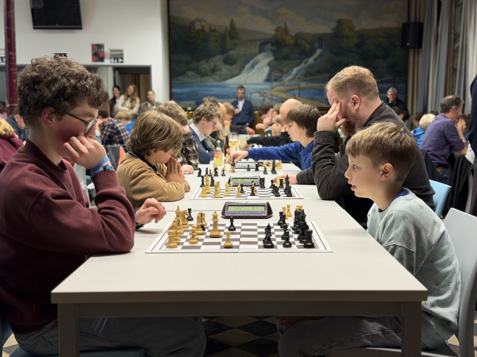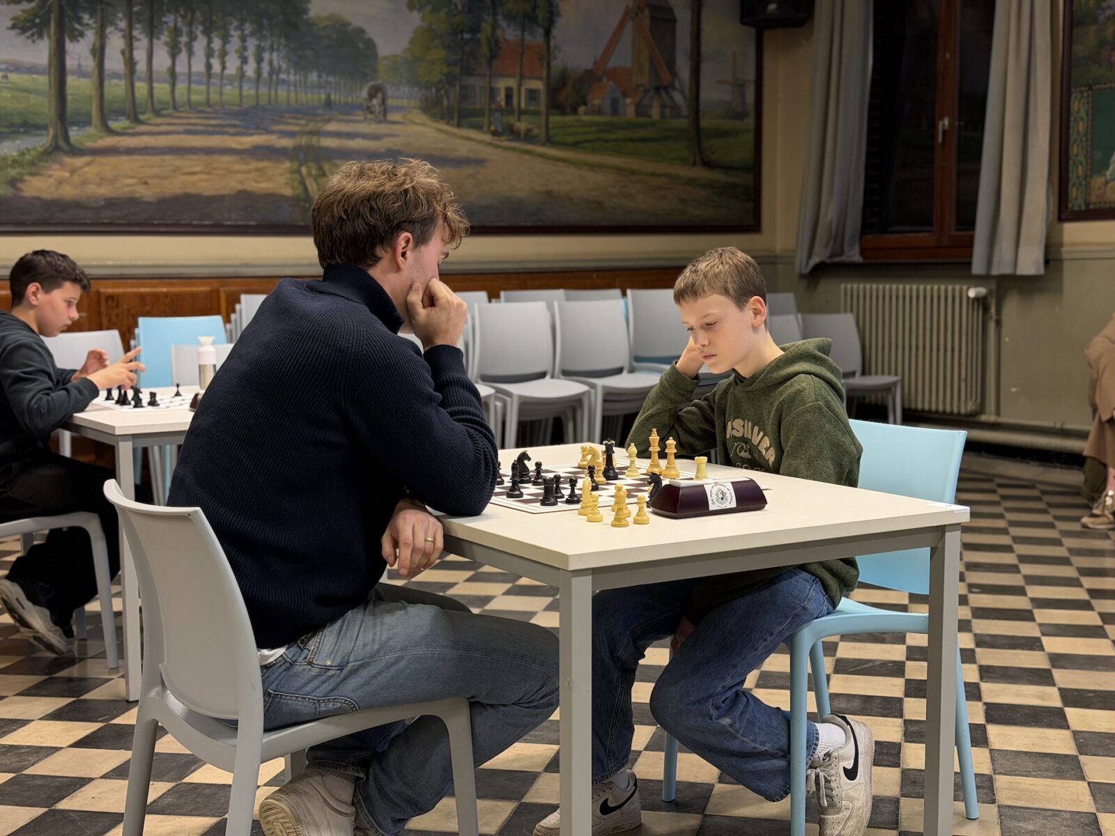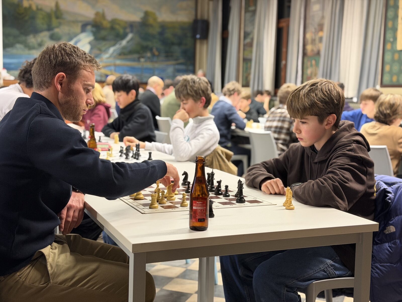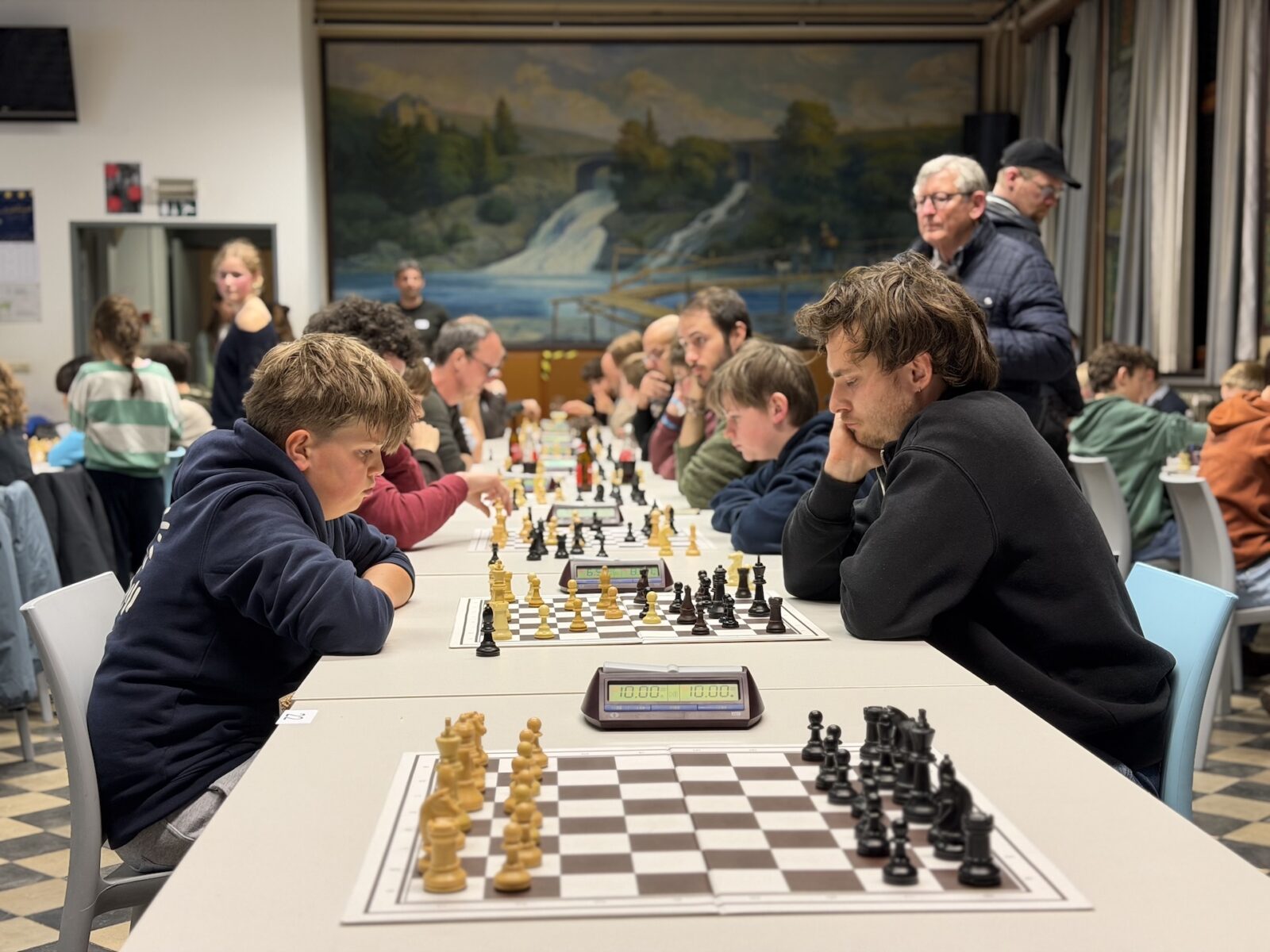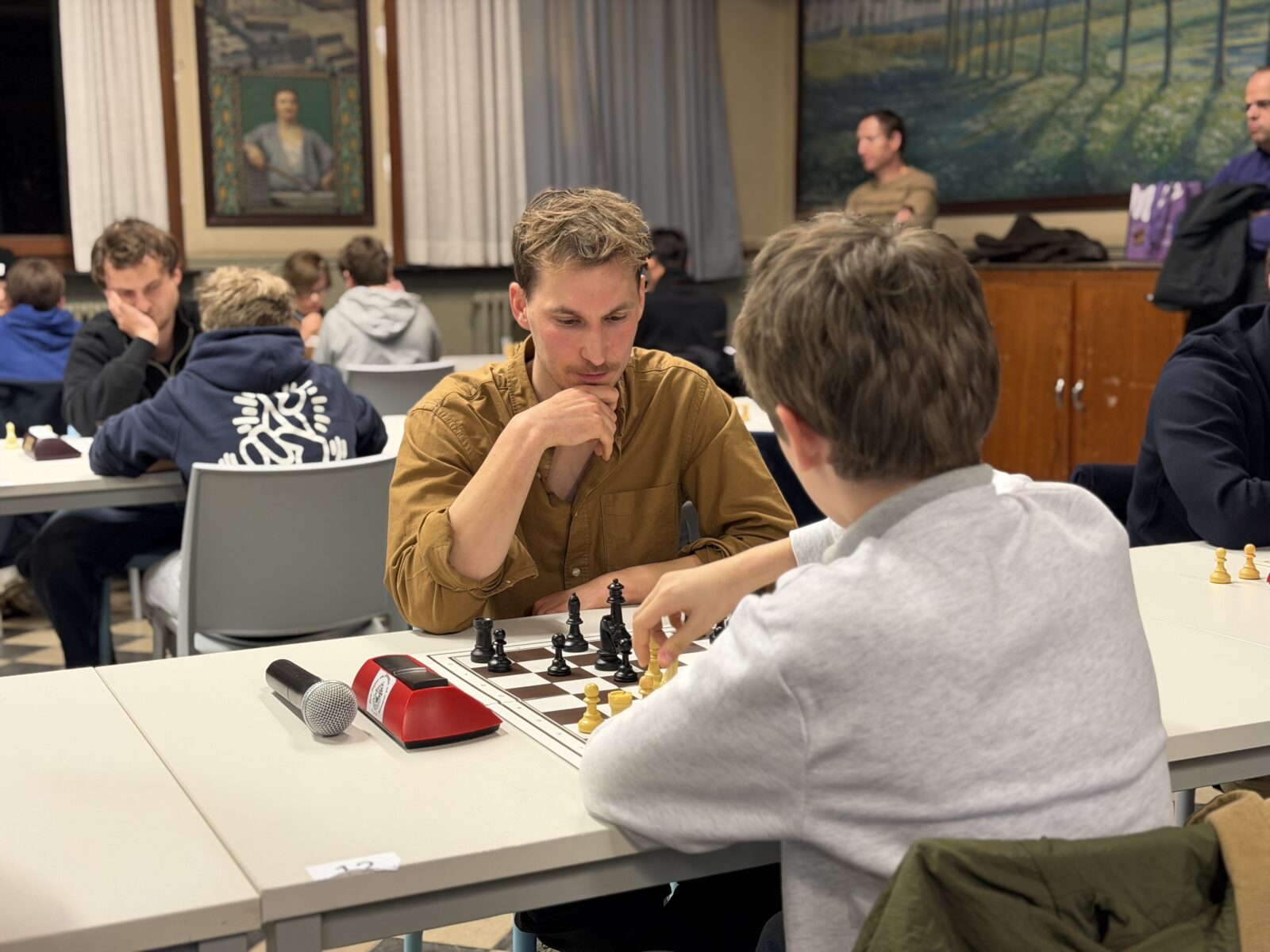 De ruime recreatiezaal van Campus Visitatie bood het perfecte decor voor deze mix van generaties: leerlingen van het eerste tot het zesde middelbaar schaakten zij aan zij met ouders, oud-leerlingen en (oud-)personeelsleden.