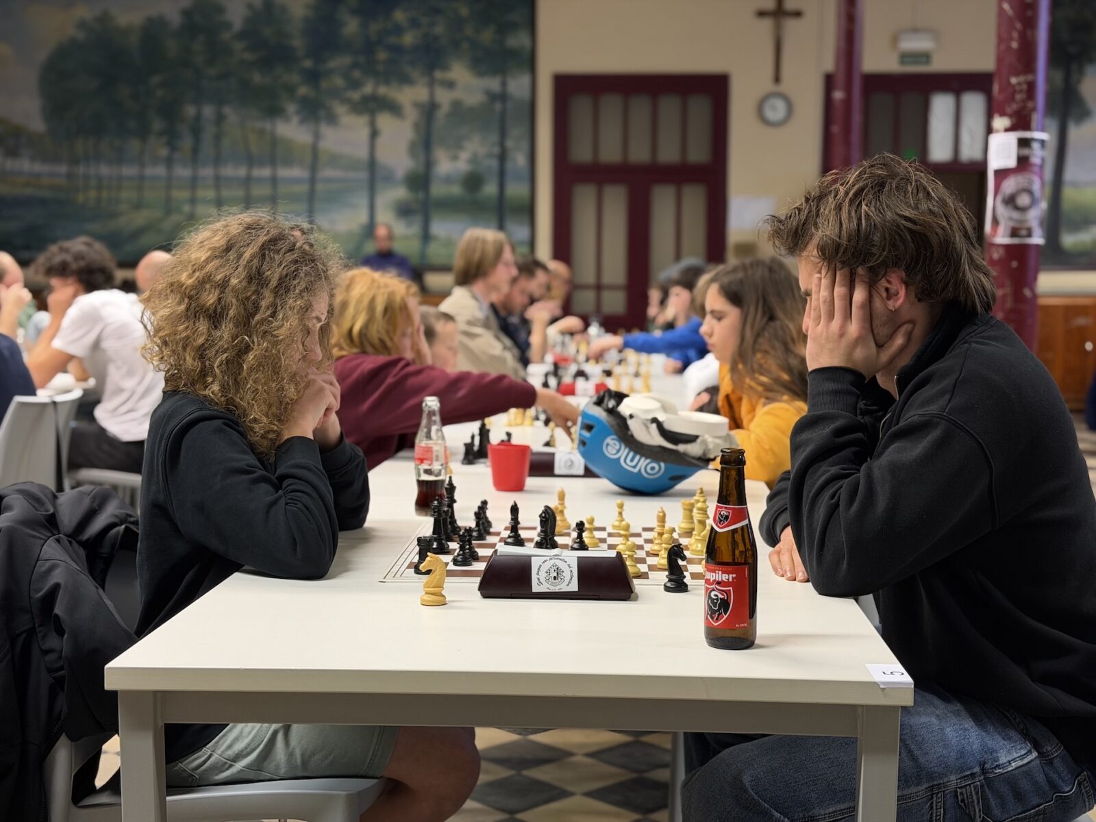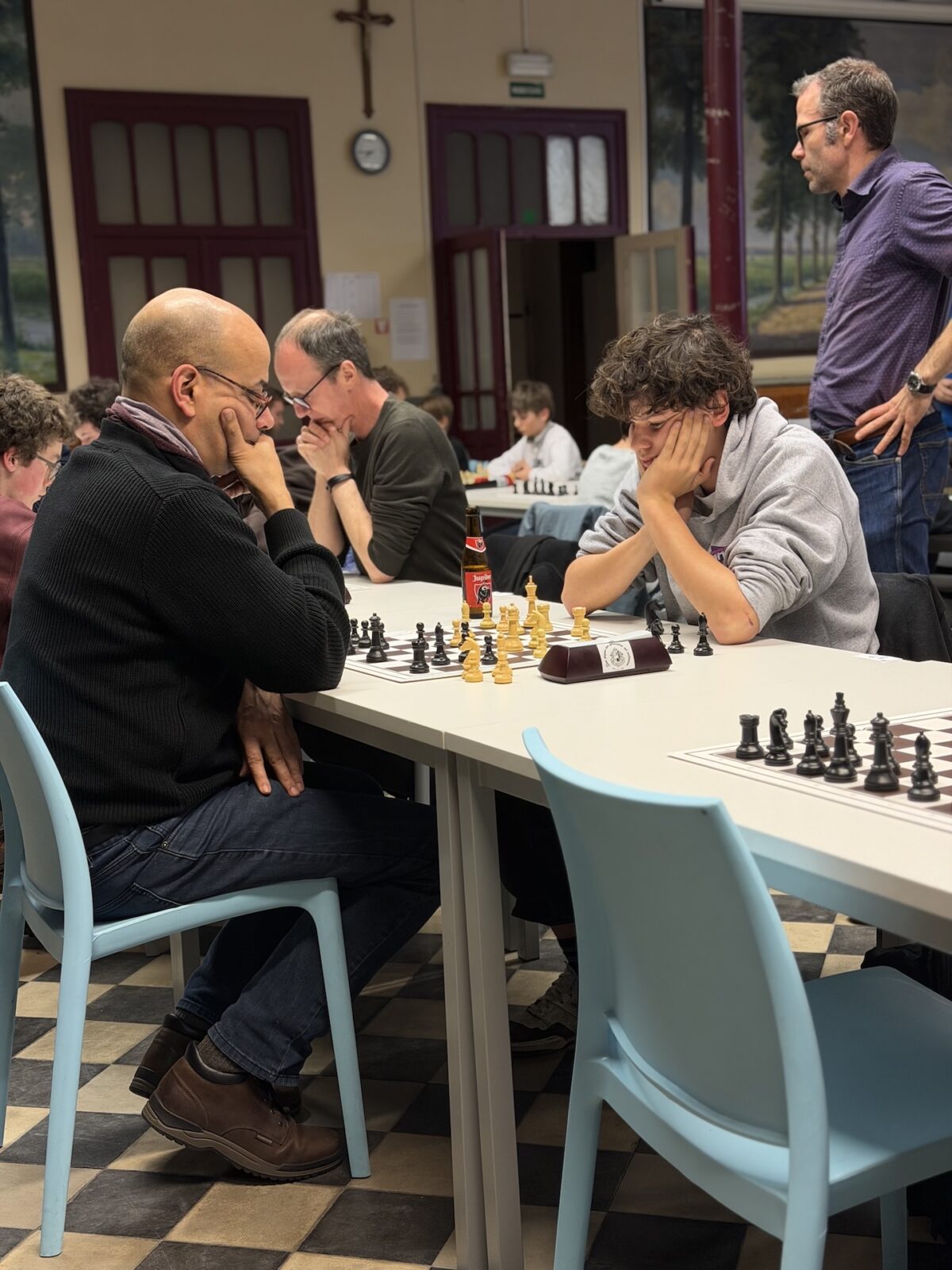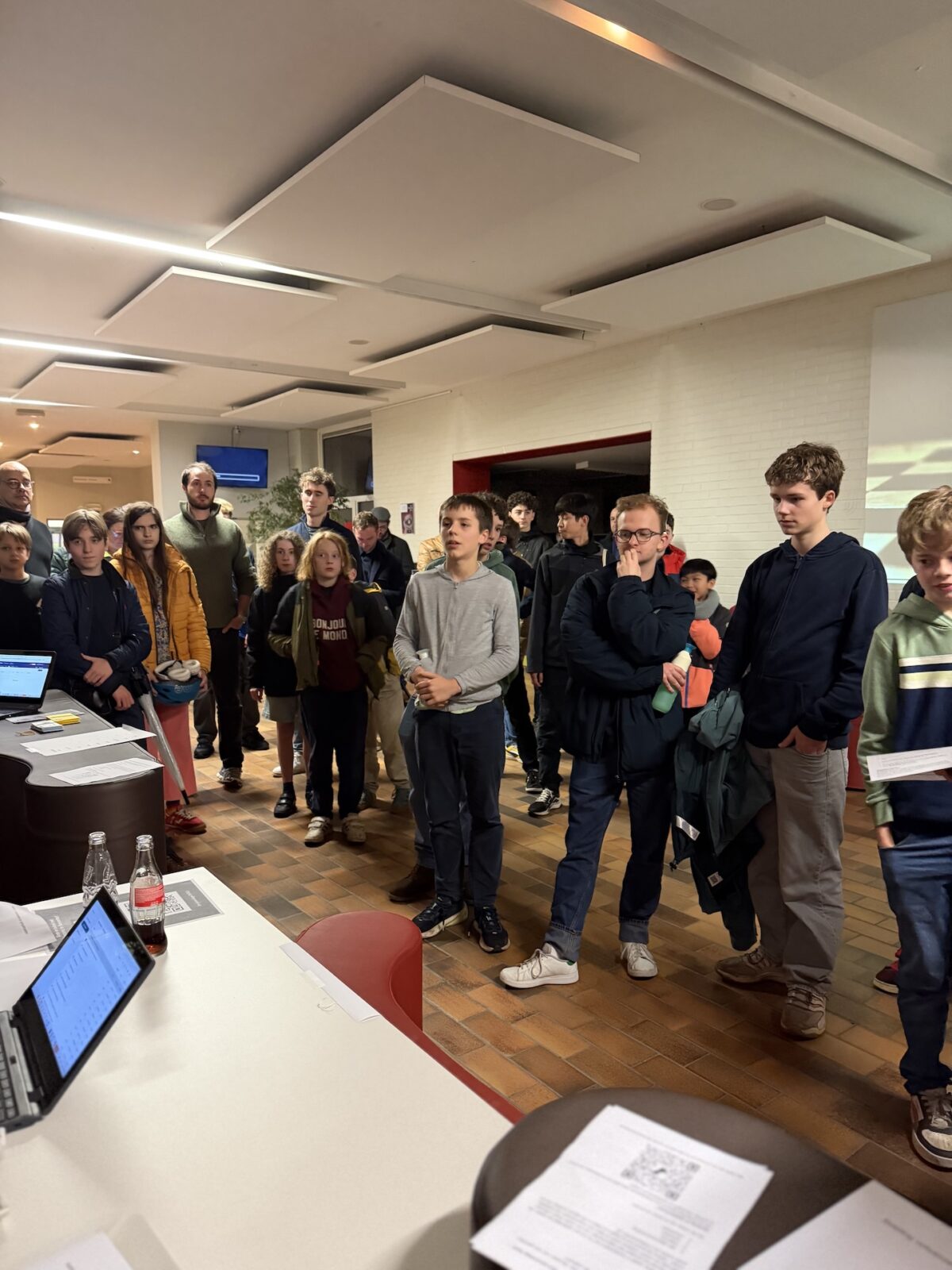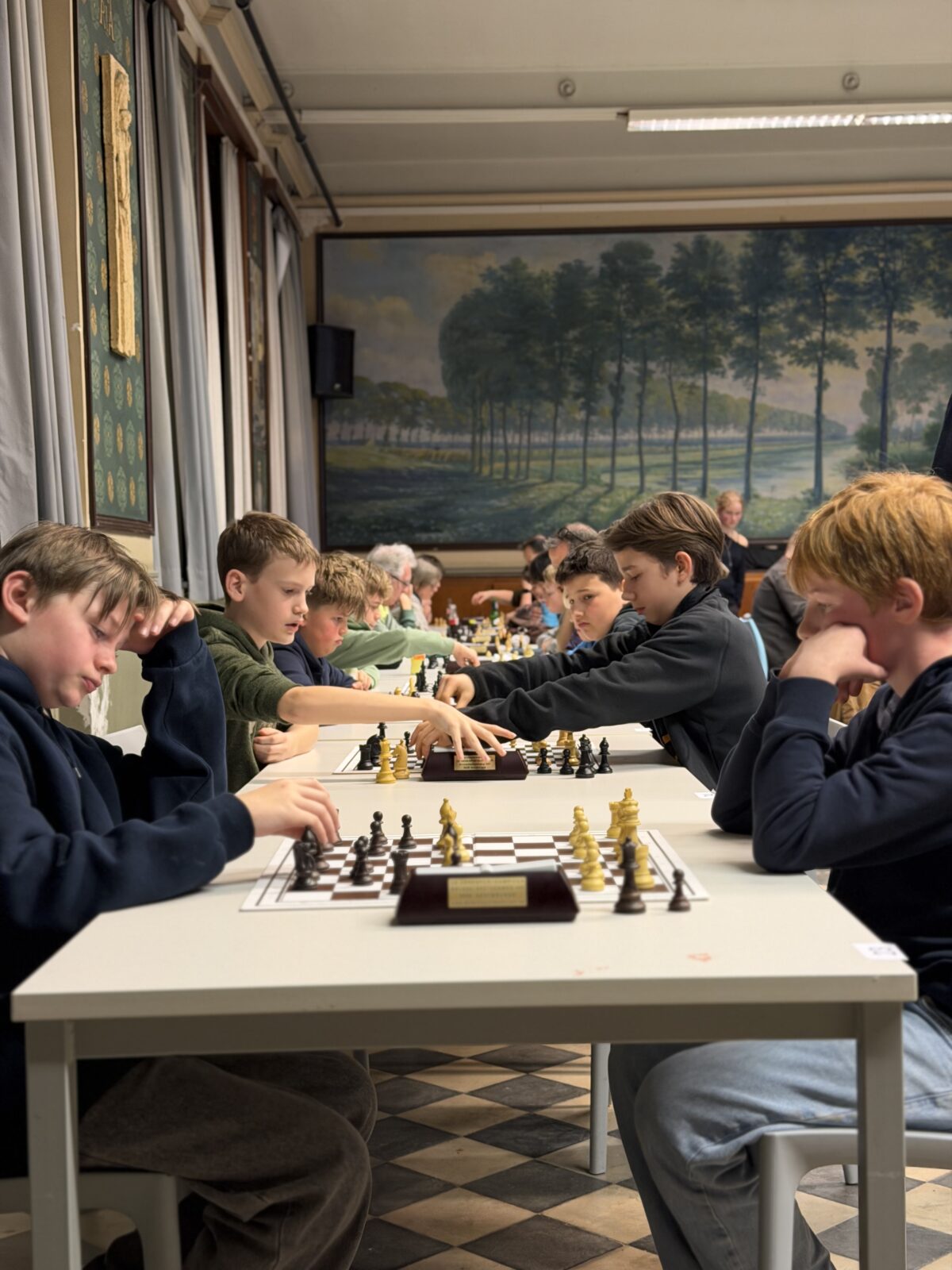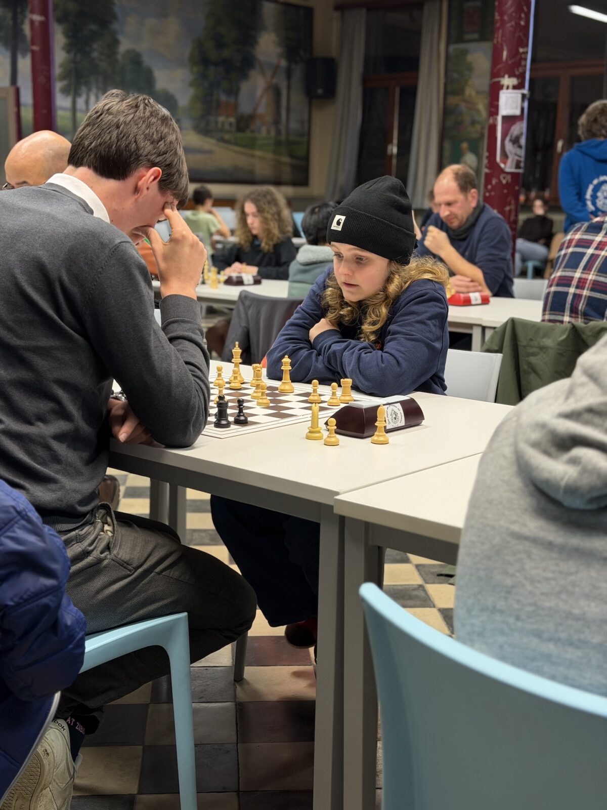 De ruime recreatiezaal van Campus Visitatie bood het perfecte decor voor deze mix van generaties: leerlingen van het eerste tot het zesde middelbaar schaakten zij aan zij met ouders, oud-leerlingen en (oud-)personeelsleden.
