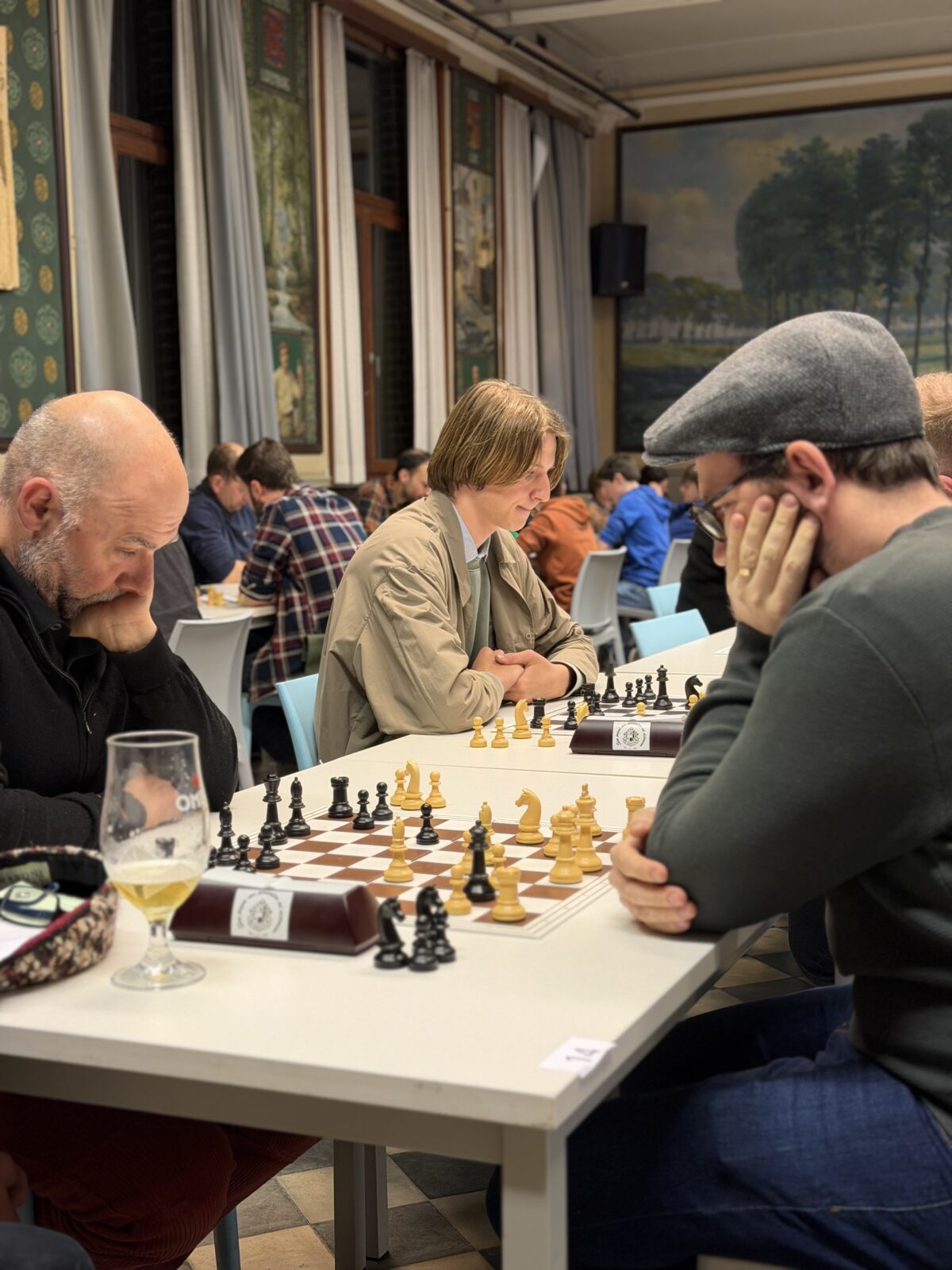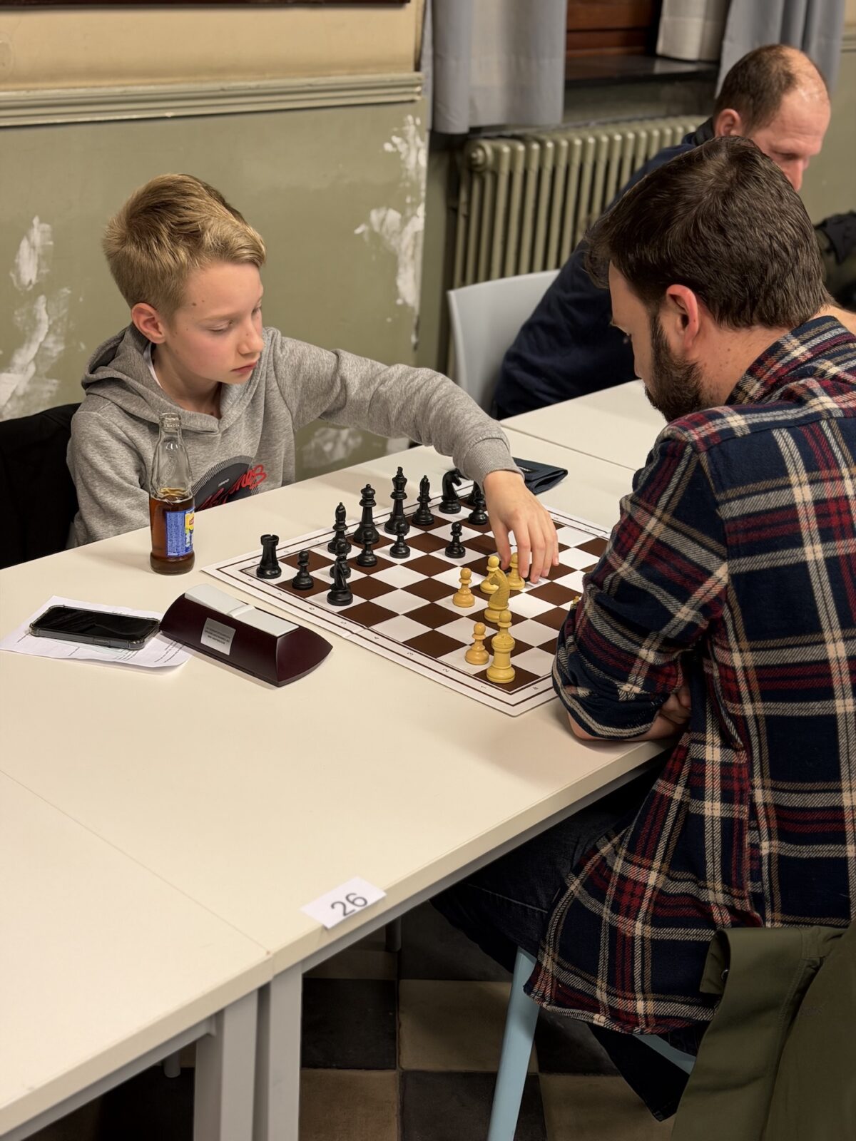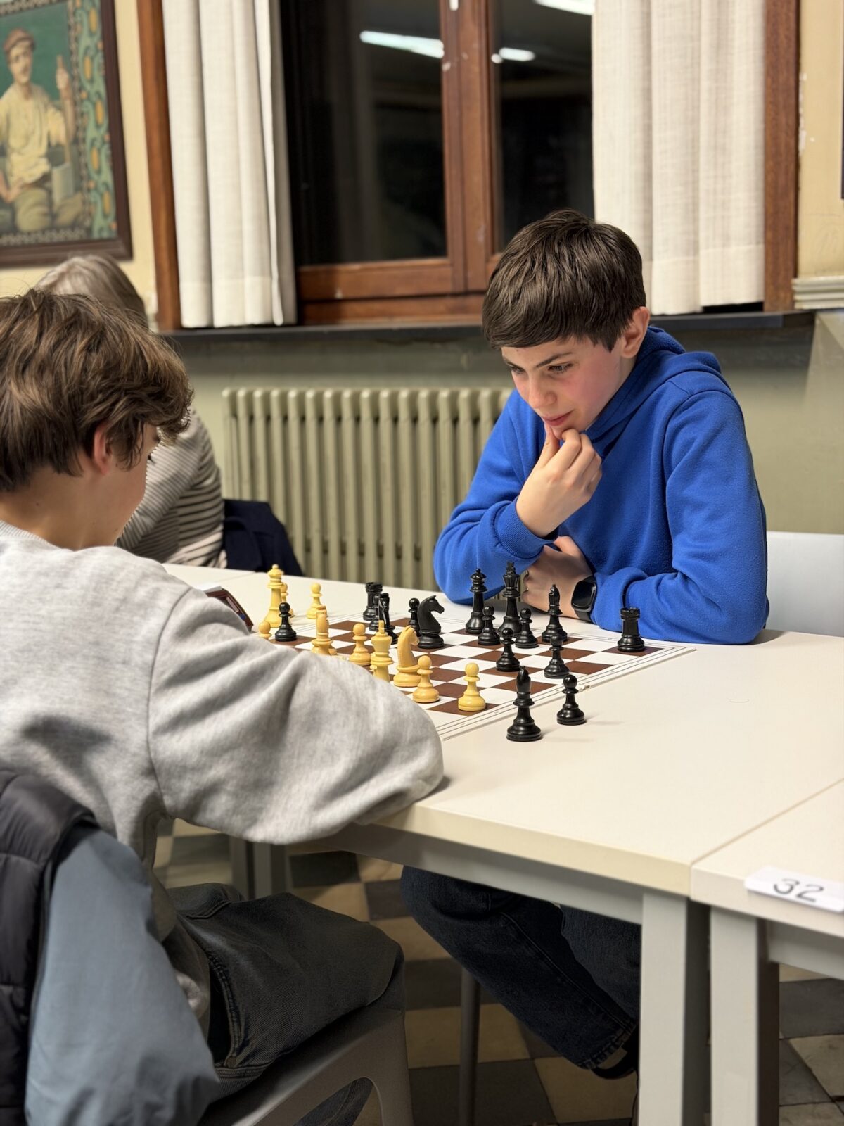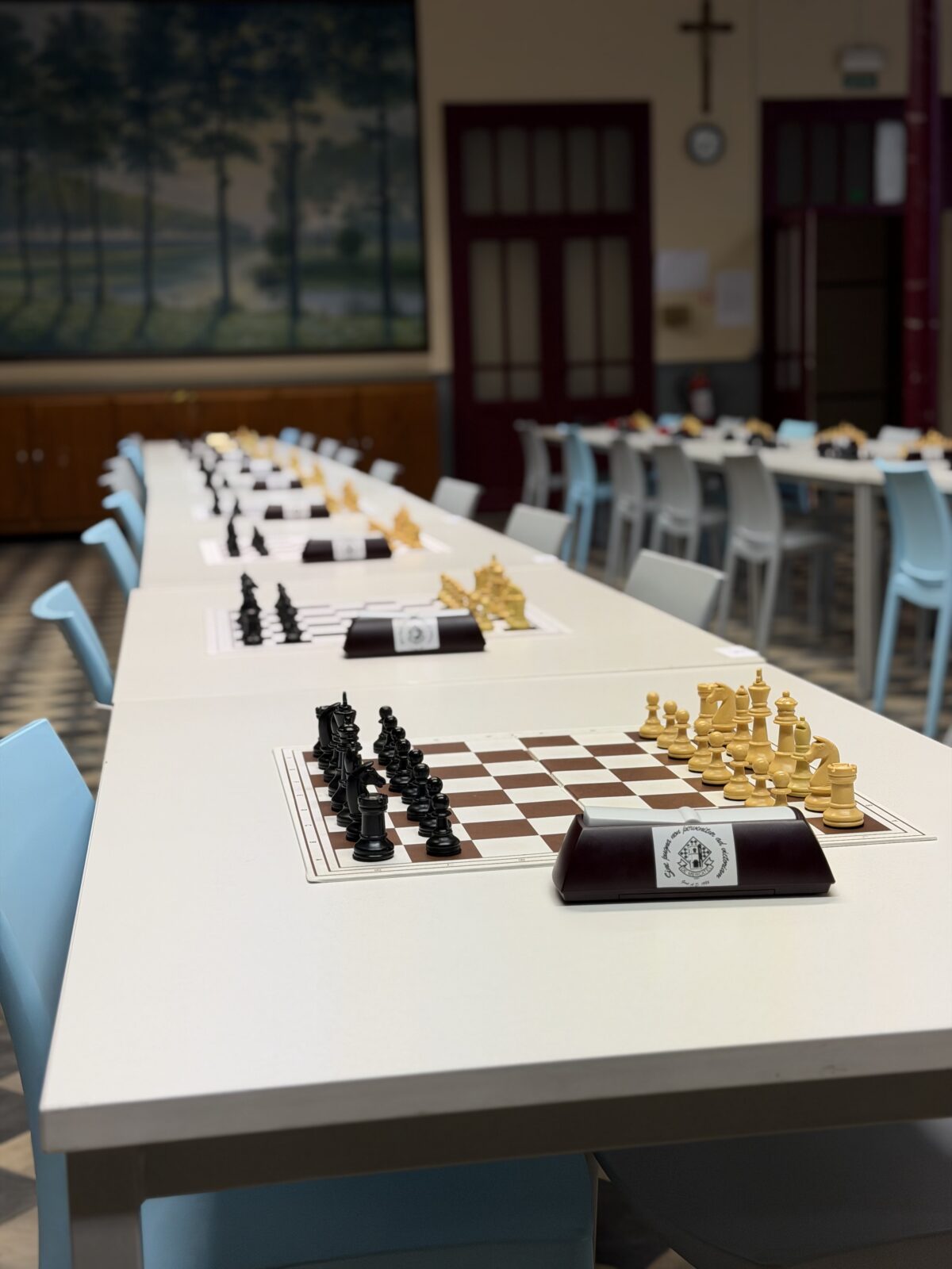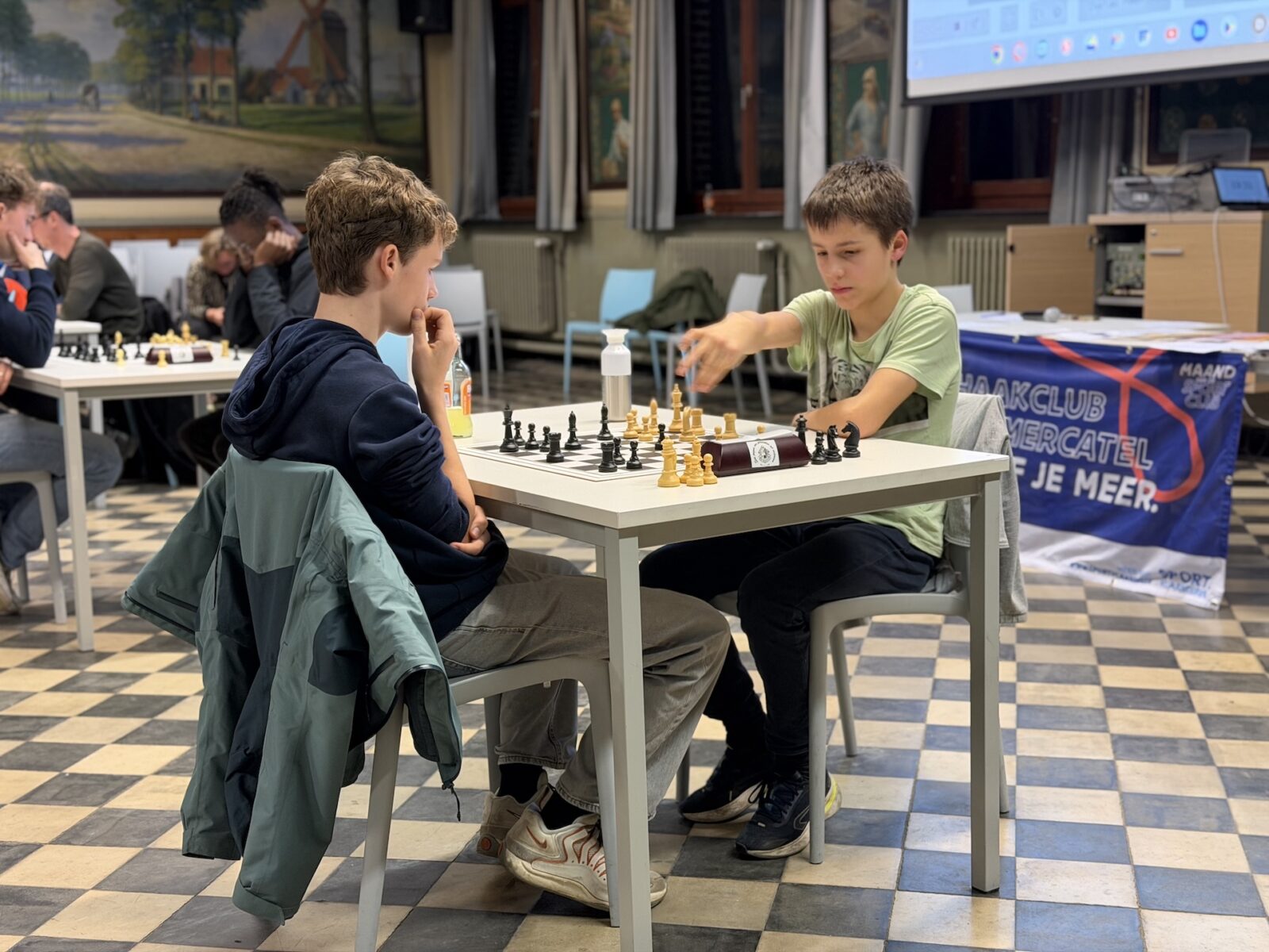 De ruime recreatiezaal van Campus Visitatie bood het perfecte decor voor deze mix van generaties: leerlingen van het eerste tot het zesde middelbaar schaakten zij aan zij met ouders, oud-leerlingen en (oud-)personeelsleden.